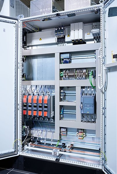 In unserem 1.000 m² großen Zentrum für Schaltschrankbau montieren, verdrahten und prüfen wir unsere Schaltschränke: Von Steuer- und Leistungsschränken über Frequenzumrichterschränke und Klemmkisten bis hin zu Bedienpulten und -stellen.