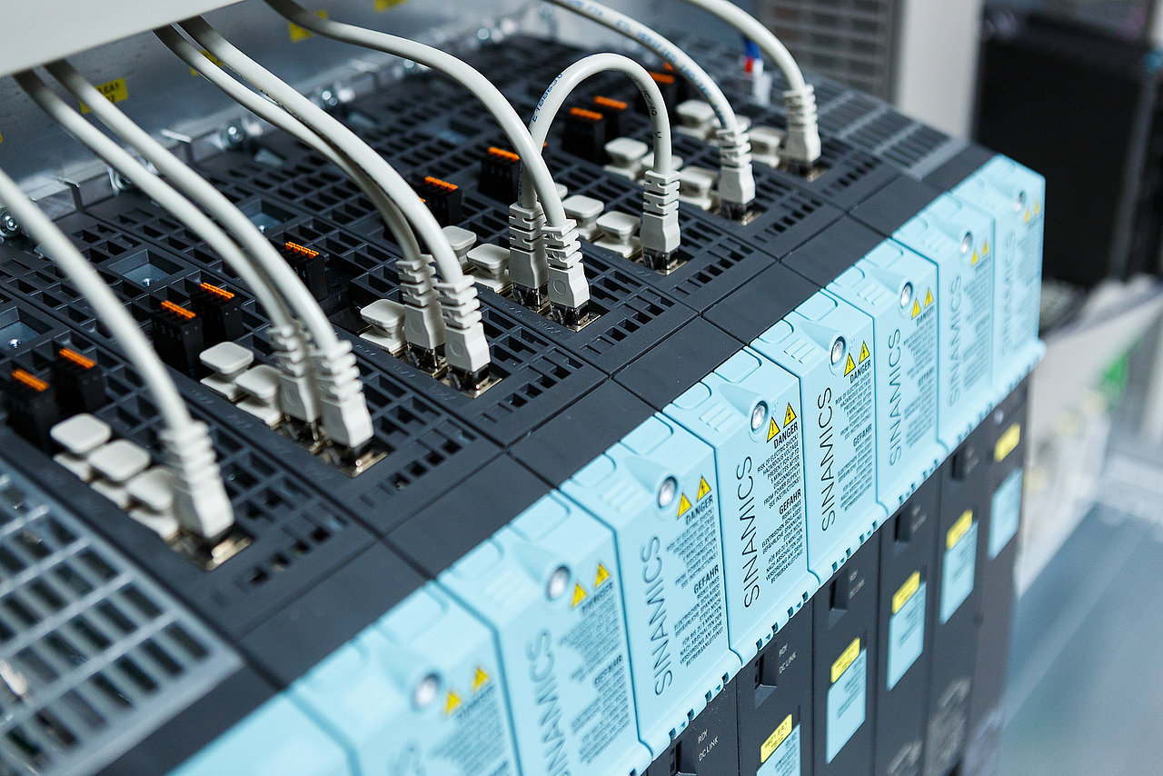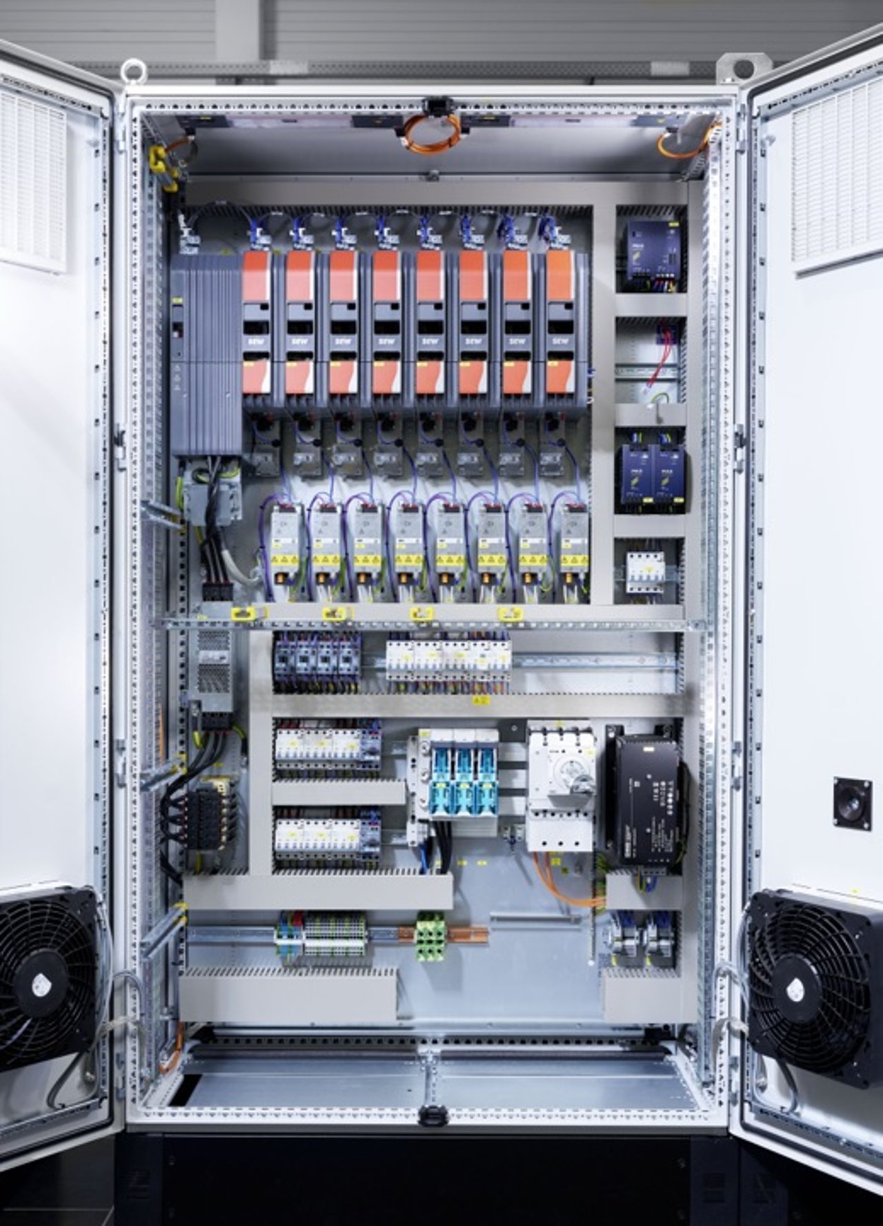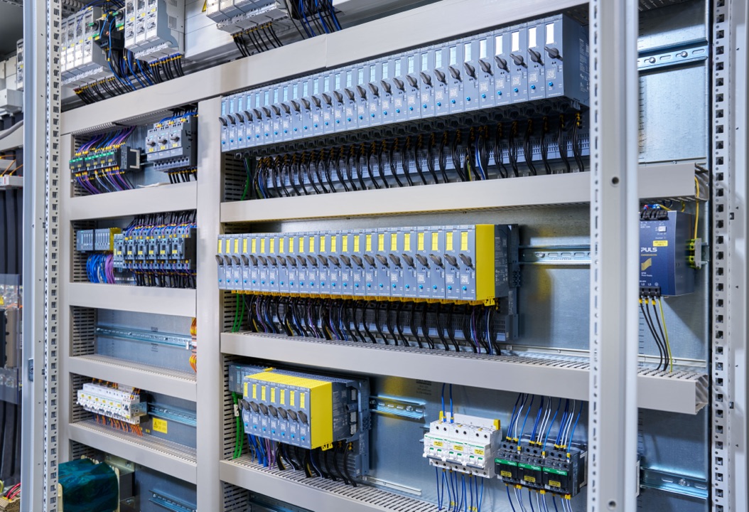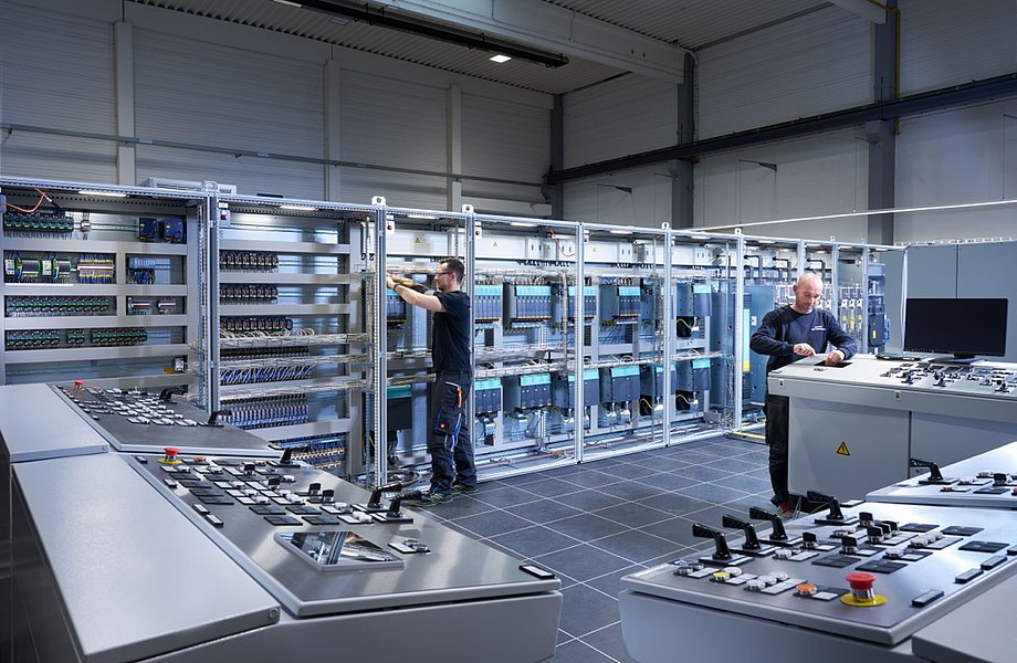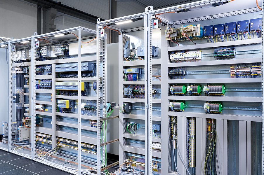 In unserem 1.000 m² großen Zentrum für Schaltschrankbau montieren, verdrahten und prüfen wir unsere Schaltschränke: Von Steuer- und Leistungsschränken über Frequenzumrichterschränke und Klemmkisten bis hin zu Bedienpulten und -stellen.